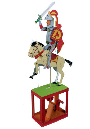 Automata are humorous and sophisticated machines with intricate designs on paper that move with cranks, levers and wooden sticks engineered to simulate lifelike motion. Turn the crank the knight raises his sword and rears his horse. The kit teaches mechanics and stimulates the imagination of kids of all ages.