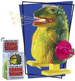Wind up this 3 inch tall terror and he will trudge forward on a city-destroying rampage, shooting fiery sparks from his mouths. Guaranteed to strike terror in the hearts of 1 inch citizens and gerbils.